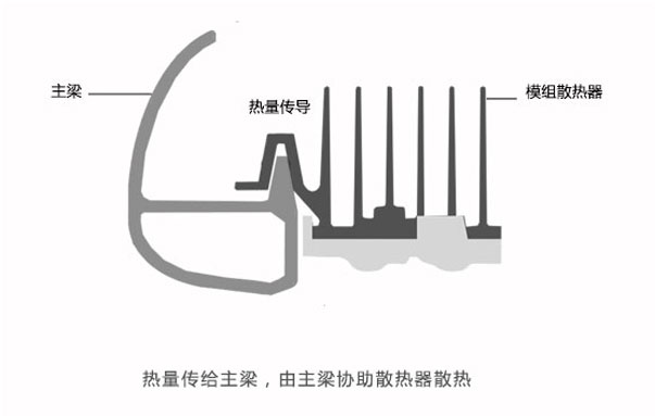 把原本只是起到支撐作用的模組支架巧妙的利用起來,使其變成一個“導熱支架”,把模組產生的熱量傳導給原本只是起到結構件作用的燈殼,使其協(xié)助模組散熱器 散熱把結構件的表面積充分利用起來,使其參與向空氣傳遞熱量