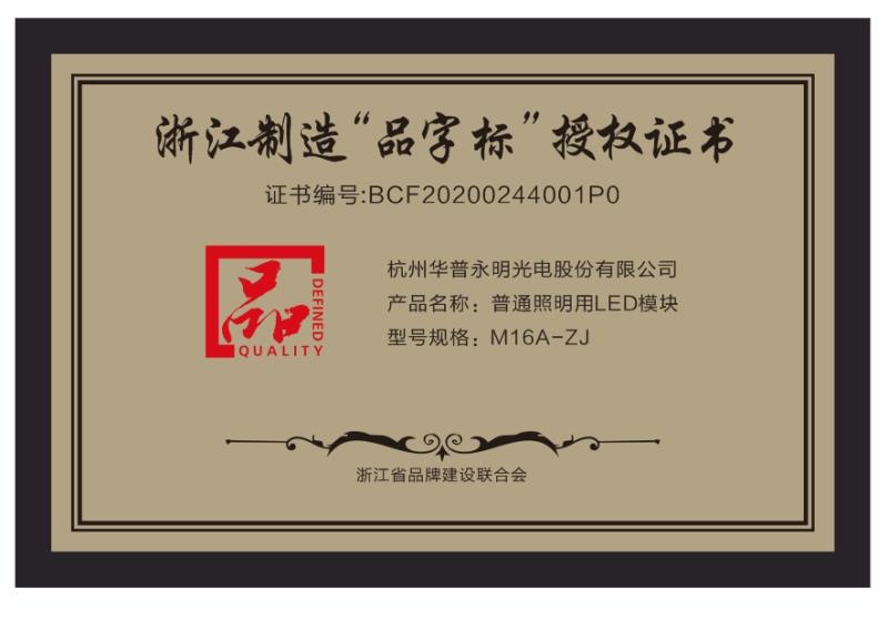 浙江制造“品牌標(biāo)”授權(quán)證書